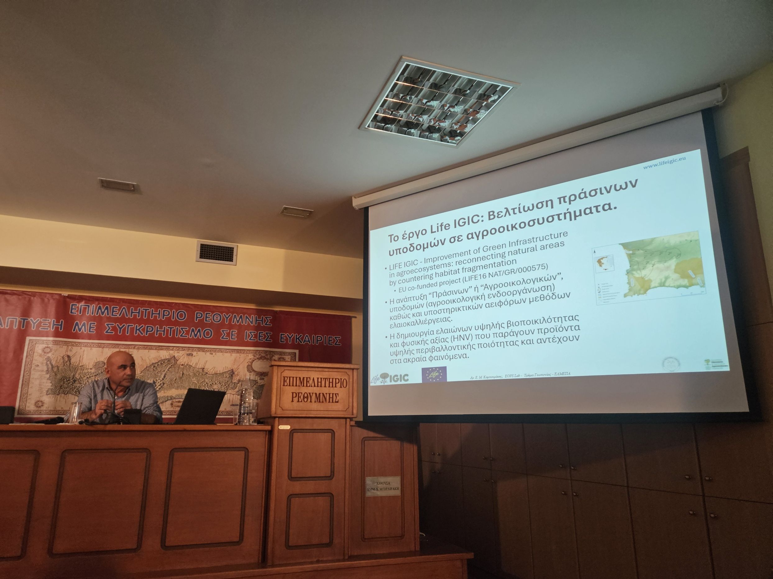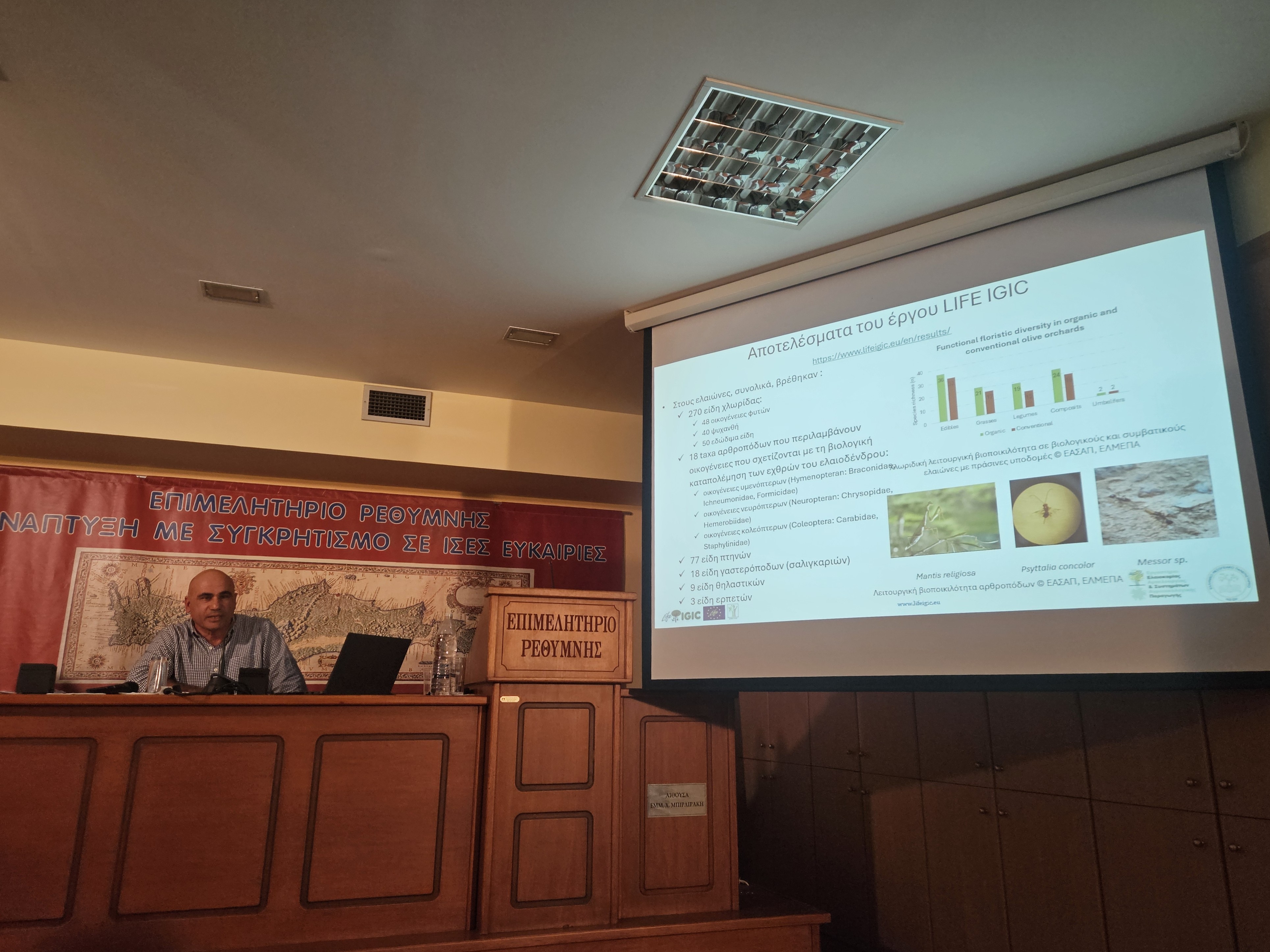 On Sunday, January 18th, 2026, during the 2nd Natura Cretica Conference “Olive Orchard – Olive Oil: From Farm to Fork” held at the Chamber of Commerce of Rethymno, the Scientific Coordinator of the LIFE IGIC project (www.lifeigic.eu), Dr. Emmanouil Kabourakis, delivered an oral presentation entitled “Green Infrastructure in Olive Orchards for Production of High-Quality Olive Oil and Adaptation to Climate Change”.