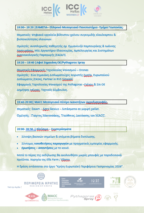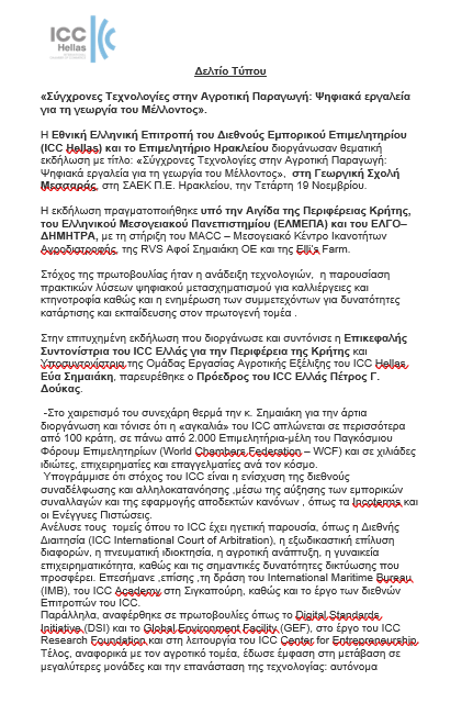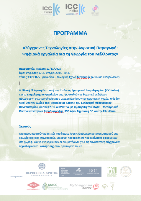 Η Εθνική Επιτροπή Ελλάδος του Διεθνούς Εμπορικού Επιμελητηρίου (ICC Hellas), σε συνεργασία με το Επιμελητήριο Ηρακλείου, διοργάνωσαν θεματική εκδήλωση με τίτλο «Σύγχρονες Τεχνολογίες στην Αγροτική Παραγωγή: Ψηφιακά Εργαλεία για τη Γεωργία του Μέλλοντος», η οποία πραγματοποιήθηκε την Τετάρτη 19 Νοεμβρίου στη Γεωργική Σχολή Μεσσαράς, στη ΣΑΕΚ Π.Ε. Ηρακλείου.