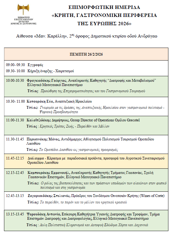 Την Πέμπτη 26/2/2026, το Σωματείο Επαγγελματιών Ξεναγών Κρήτης και Σαντορίνης διοργάνωσε επιμορφωτική ημερίδα με τίτλο «ΚΡΗΤΗ, ΓΑΣΤΡΟΝΟΜΙΚΗ ΠΕΡΙΦΕΡΕΙΑ ΤΗΣ ΕΥΡΩΠΗΣ 2026».