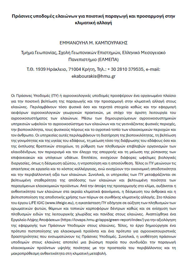 Την Κυριακή, 18 Ιανουαρίου 2026 κατά τη διεξαγωγή του 2ου Συνεδρίου της Natura Cretica «Ελαιώνας – Ελαιόλαδο: Από το Χωράφι στο Ράφι» που πραγματοποιήθηκε στο Επιμελητήριο Ρεθύμνης, ο επιστημονικά υπεύθυνος του έργου LIFE IGIC (www.lifeigic.eu), Δρ. Εμμανουήλ Καμπουράκης συμμετείχε σε προφορική εισήγηση με τίτλο «Πράσινες Υποδομές ελαιώνων για ποιοτική παραγωγή και προσαρμογή στην κλιματική αλλαγή».
